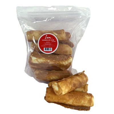 De I am Kauwrol Kip 15 cm 10 st is een lekkere kauwsnack bestaande uit runderhuid gewikkeld in gedroogde kip, zonder suiker en glutenvrij. De kauwrol is gemaakt van extra dikke runderhuid, om op te kauwen. Kauwen op runderhuid gaat verveling tegen en helpt bij het verzorgen van het gebit, omdat de huid langs de tanden wrijft en zo tandplak en tandsteen helpt te verminderen. De rol is omwikkeld met een jasje van gedroogde kip voor extra smaak en stimulans.