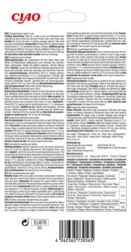 Samenstelling: Water, Kip, Tapiocazetmeel, Cellulosepoeder, Natuurlijke smaakstoffen, Guargom, Natuurlijk Sint-Jacobsschelparoma, Vitamine E-supplement, Taurine, Groene Thee-extract