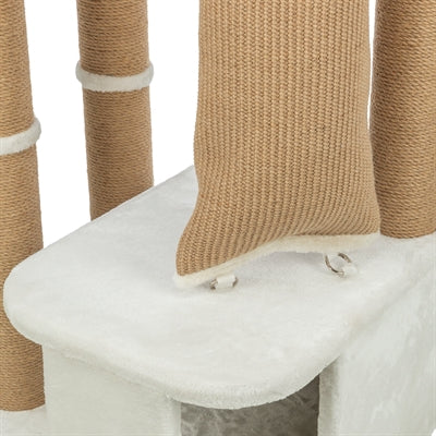 De Trixie Krabpaal Active Wit is een stevige en veelzijdige krabpaal die perfect is voor actieve katten. De paal is bekleed met jute van 5 mm dikte en zacht pluche van 400 g/m², waardoor je kat heerlijk kan krabben en spelen. Deze krabpaal heeft een grote klimzak van jute, een comfortabel mandje met een bekleed ligplateau en een gevoerde rand. Daarnaast biedt de schuilplaats binnenin een fijne plek om te rusten, bekleed met pluche en fleece voor extra comfort.